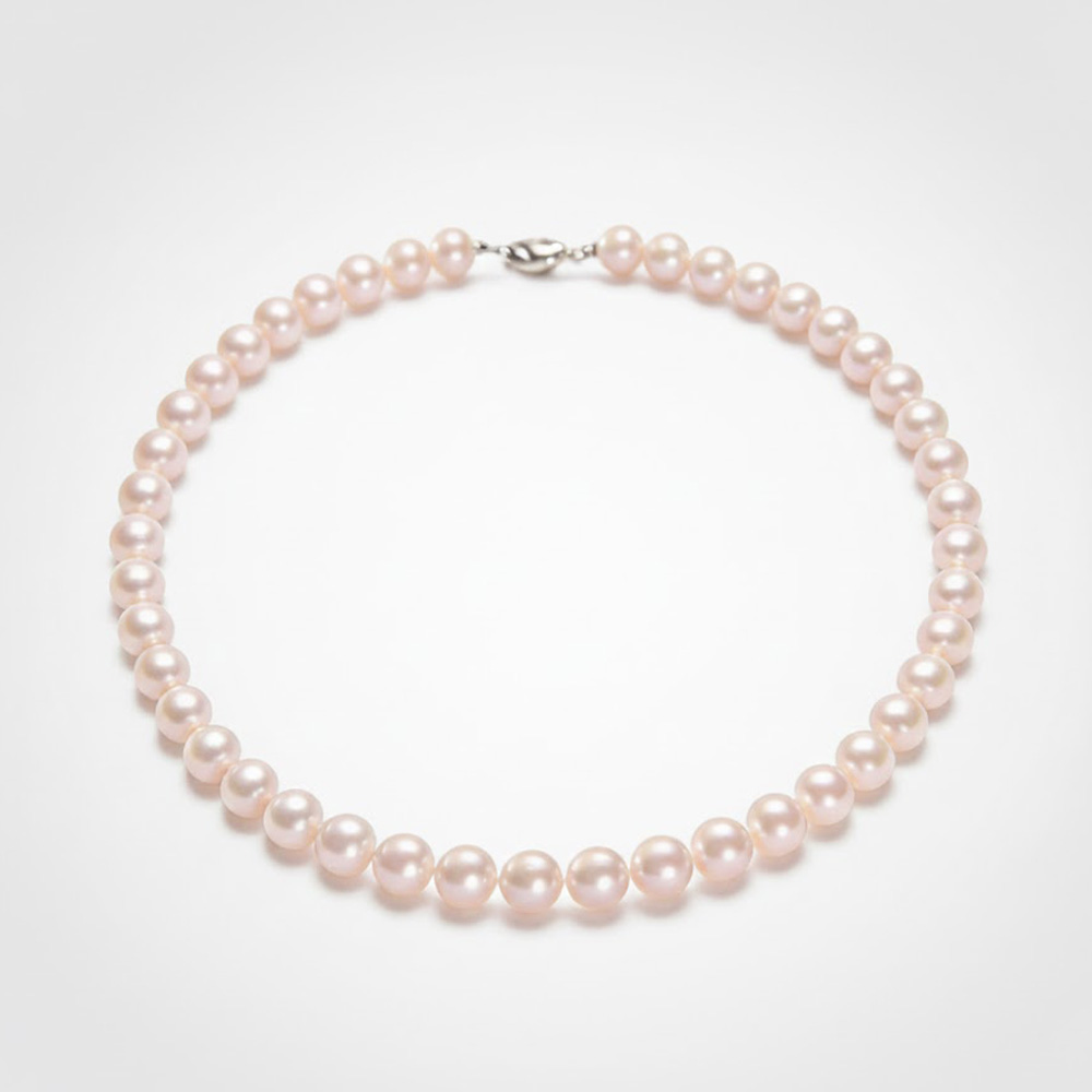 Generate a model wearing this [NECKLACE PHOTO] with a simple white shirt or blouse, straight-on camera angle, neutral studio background. Emphasize how the necklace sits against the neckline, ideal as a standard styling reference on e-commerce product pages.